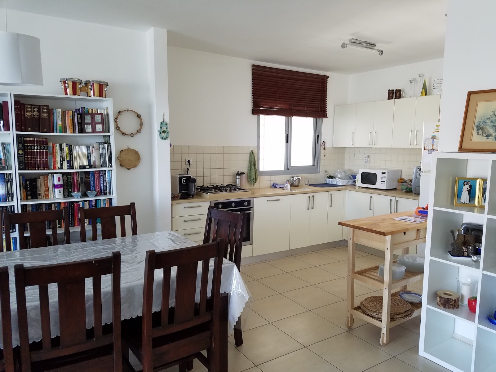 Here's a view of the dining area. This apartment is furnished, which is not very common. Since we did not ship furniture and appliances to Israel, we thought it would be good to rent an equipped apartment for the first year, to save us from having to immediately go out and spend thousands of dollars to furnish and equip an apartment or house. The bookcases and books, the area rugs, the pictures on the wall and the flat-screen TV, are ours.